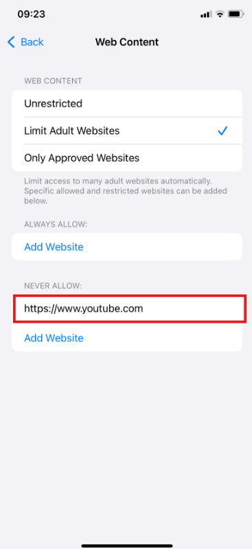 Dentro de Restrições de Conteúdo, acesse Conteúdo Web e bloqueie o acesso ao site do YouTube.