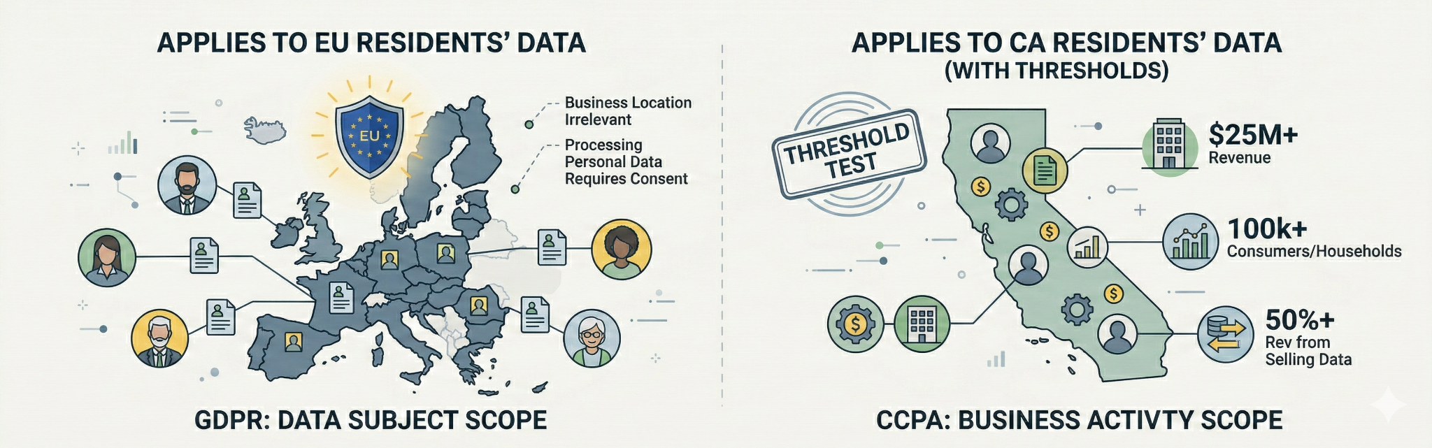- GDPR is comprehensive and consent-focused, applying globally to EU residents.