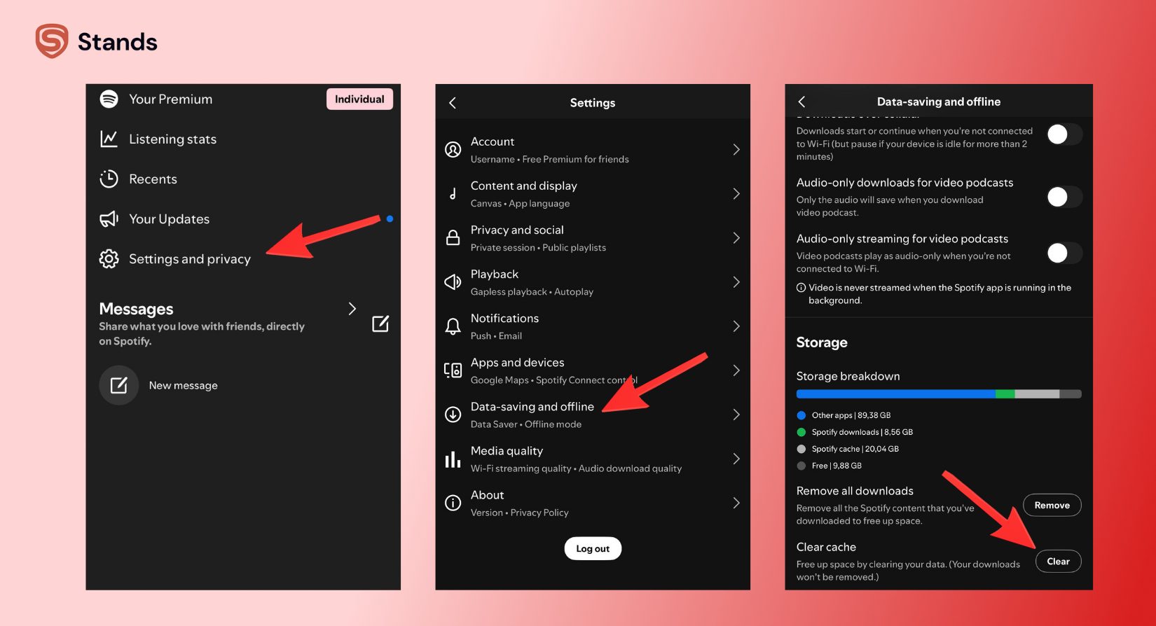 Over time, Spotify stores cache files on your device, so it can load songs faster and improve playback. Sounds great… until your storage fills up and your phone starts complaining.