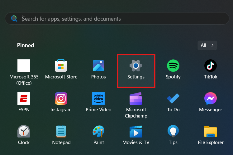 - Haz clic en el botón de Inicio para abrir la Configuración.