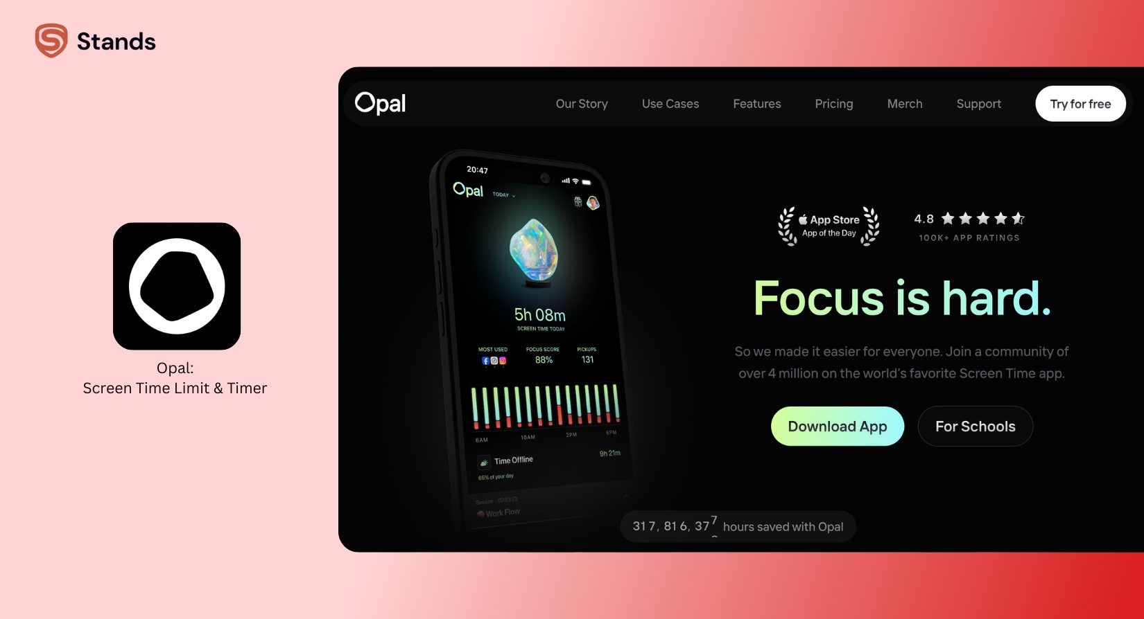 Si buscas algo más estructurado (y, sinceramente, más estricto), Opal suele considerarse la opción más exigente para la desintoxicación digital. Utiliza sesiones de concentración profunda y análisis de IA para monitorizar tus hábitos y bloquear el acceso a las aplicaciones cuando más lo necesitas. Es especialmente popular entre quienes buscan una verdadera responsabilidad en lugar de simples recordatorios.